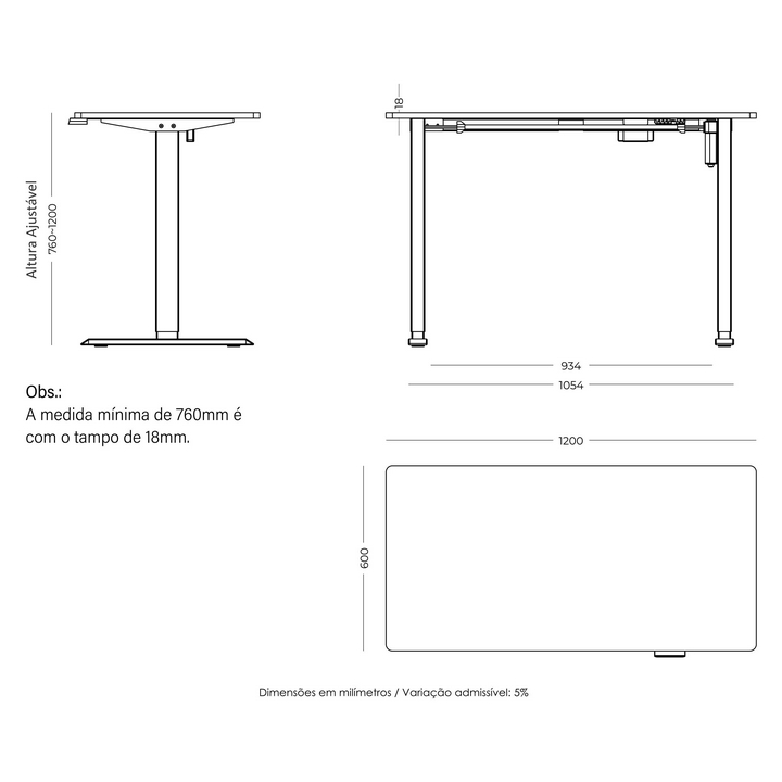 Mesa elevatória elétrica 02 estágios - tubo retangular. velocidade de elevação 30 mm/seg. posição mais alta 1.200 mm. posição mais baixa 760 mm, bivolt. tampo cor branca mdfde 18mm 1200 mm x 600 mm