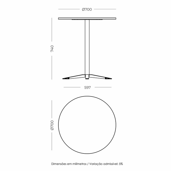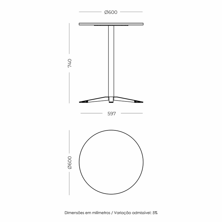 Mesa flow meals com tampo circular de 600/700 mm de diâmetro, revestido em laminado melamínico nas duas faces e bordas com perfil polimérico arredondado na mesma cor. altura de 740 mm. estrutura metálica em aço carbono com coluna central e base de quatro apoios, com pintura eletrostática.