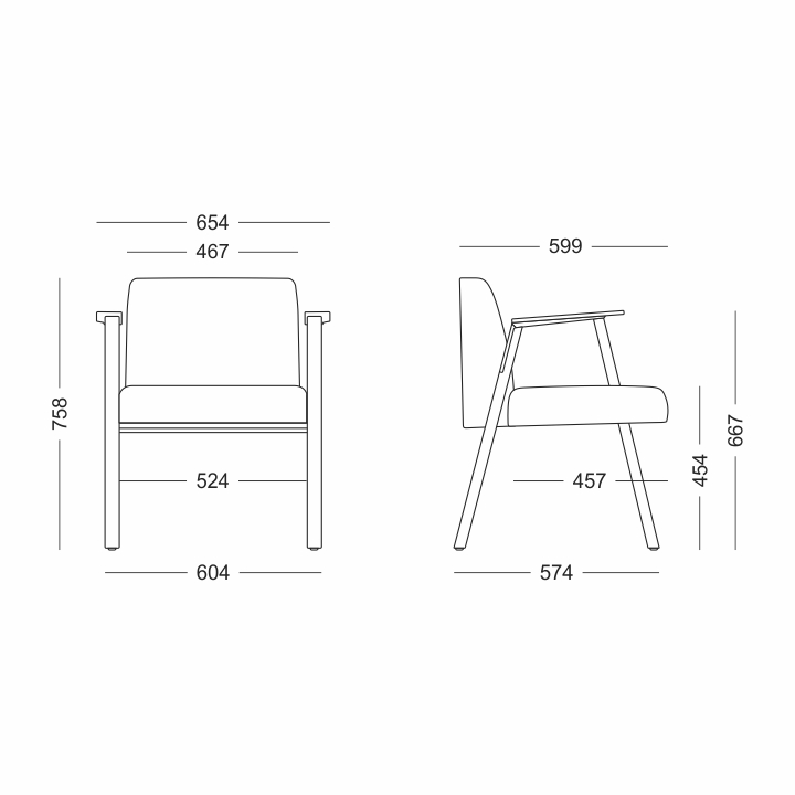 Os braços da poltrona são fixados diretamente à estrutura, confeccionados em madeira com acabamento natural lixado e envernizado, proporcionando conforto ao toque, resistência ao desgaste e contraste visual acolhedor.