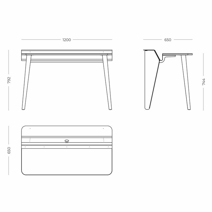 Mesa retangular com tampo em madeira com perimetro de 1200mm x 650mm, integrada a um suporte em aço com aplicação de pintura épox-pó, em diversas cores.