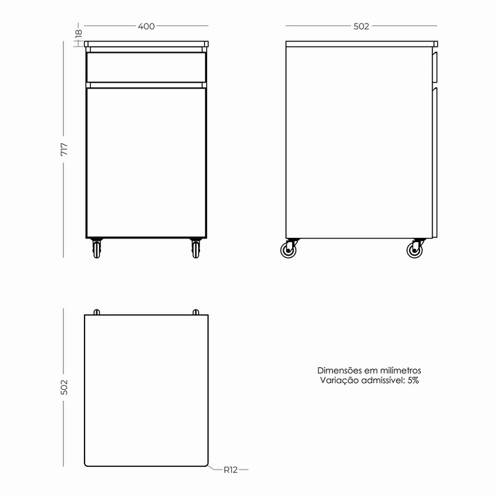 SAFE estruturado em madeira, confeccionado em material de superfície lisa e acabamento uniforme na cor branca. Ele possui estrutura retangular vertical com rodízios nos quatro pés, o que facilita seu deslocamento. A parte superior do móvel comporta uma gaveta com frente reta. Abaixo da gaveta, há uma porta maior, também com frente lisa e alinhamento com a gaveta superior, formando um conjunto visualmente limpo e moderno. A base inferior é fechada, com recuo suficiente para a fixação dos rodízios, garantindo mobilidade sem comprometer a estética.