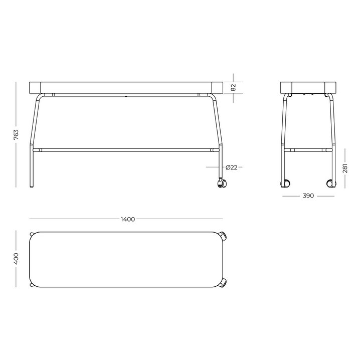 Estrutura alta em aço, com pintura epox-pó com possibilidade de pintura em diversas cores e rodízios em pista pu, indicados para piso frio.