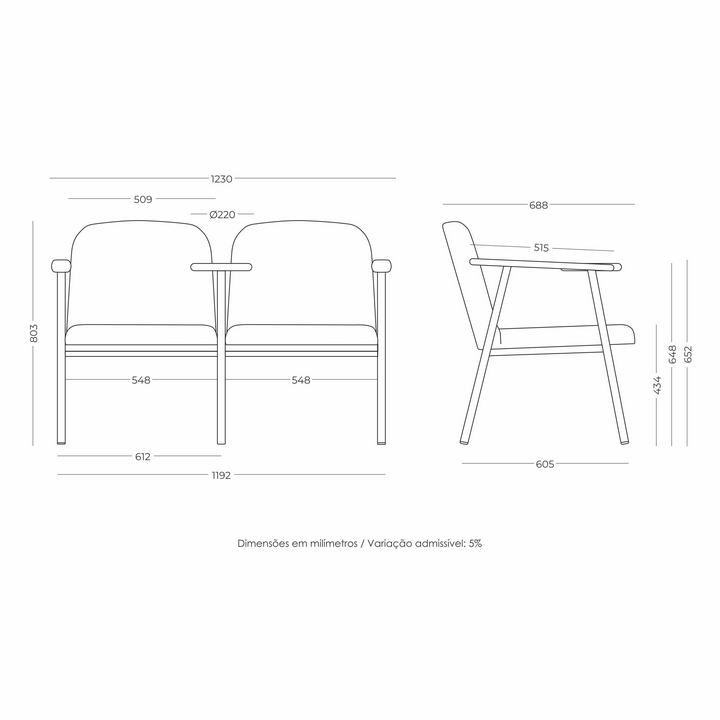 Os braços da poltrona são fixados diretamente à estrutura, confeccionados em madeira com acabamento natural lixado e envernizado, proporcionando conforto ao toque, resistência ao desgaste e contraste visual acolhedor.